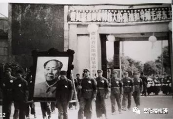 “繼承毛主席的遺志,把無產(chǎn)階級革命事業(yè)進行到底”的橫幅下,心情沉重的岳陽軍分區(qū)隊伍擁著毛主席遺像緩緩步入追悼會會場