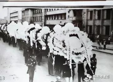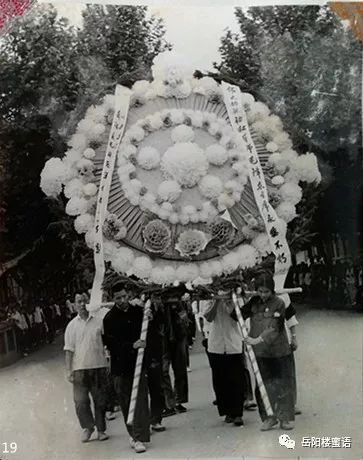 人們抬著巨大的花圈悼念毛主席,第一個花圈是“中國共產(chǎn)黨岳陽地區(qū)委員會”的。