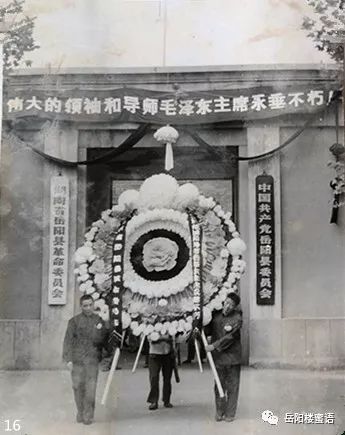 人們抬著毛主席的巨幅遺像參加悼念。岳陽地區(qū)革命委員會門楣上掛著“極其悲痛地哀悼偉大的領(lǐng)袖和導師毛澤東主席”的橫幅