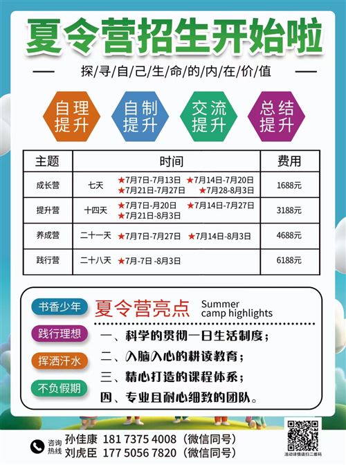 因受洪災影響,書香少年夏令營姍姍來遲,最終定在7月20日(也就是下周六)開營,家長朋友們有意向的趕緊報名了,夏令營的服裝道具生活物資等正在緊張準備中!優惠不變,歡迎參加!